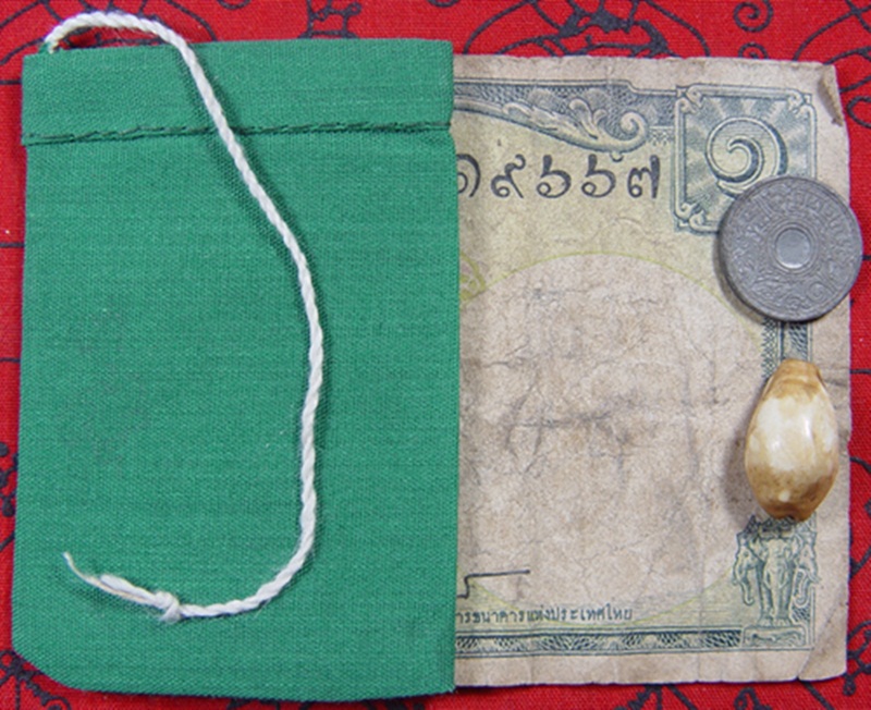 ถุงเขียวเหนี่ยวทรัพย์ คุณแม่บุญเรือน โตงบุญเติม ถุงเหนี่ยวทรัพย์สีเขียวอันเลื่องชื่อของคุณแม่บุญเรือน ซึ่งลูกศิษย์ทุกคนใฝ่ฝันอยากเป็นเจ้าของ มีรอยจารยันต์ "พุทโธ..."ด้วยดินสอ รูปที่ ๒ ตรงตำแหน่งข้างถุงซ้ายมือ ของจริงเห็นชัดครับ กว้าง ๔.๕ เซนติเมตร ยาว ๖.๕ เซนติเมตร ชิ้นนี้ใช้เป็นชิ้นครูได้ครับ |