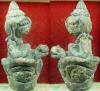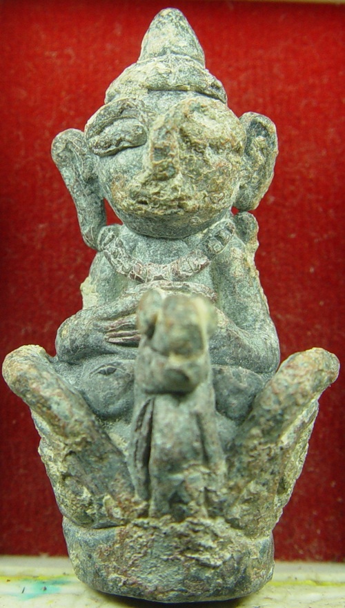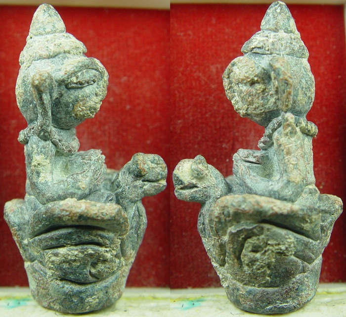 อุปคุตเขมรพันปี (กรุปราสาทภเตชมา:บัณฑายฉมาร์) เนื้อสำริดขอมโบราณพันปี มีน้ำหนักหน่วงมือมากครับ ฐานกว้าง ๒ เซนติเมตร สูง ๓ เซนติเมตร จากฝั่งเขมร กรุเขมร กรุณาสังเกตุคราบกรุของกรุปราสาทภเตชมานะครับ เป็นสนิมแดง ต่างจากกรุปราสาทเขาขาด ลักษณะศิลปะก็ต่างกันครับ สวยมากครับ สมบูรณ์ ๑๐๐% สภาพวัตถุมงคลอายุ ๑๐๐๐ ปีต้องเป็นอย่างนี้ ลักษณะเด่น หูยาวจรดไหล่ คิ้วกับจมูกเป็นเส้นเดียวกัน ตาโปนเป็นแท่ง เศียรคล้ายยอดเจดีย์ เม็ดพระศกสองแถว เม็ดพระศกชัดเจน อุ้มบาตร ************* ฐานวัตถุสมัยโบราณต้องเป็นสัญญลักษณ์เลข ๑ อย่างนี้ครับ จึงจะเป็นวัตถุมงคลเขมรยุคต้น ยุคเดียวกับกริ่งเขมร ยอดหายาก ************* ********* การสร้างรูปหล่อทางพระพุทธศาสนา ตามปราสาทต่างๆของขอมโบราณนั้นเกิดขึ้นในช่วงที่มีการเปลี่ยนเทวสถานเป็นพุทธสถาน ดังนั้นรูปหล่อที่บรรจุกรุตามปราสาทต่างๆนั้นจึงผสมผสานระหว่างพุทธศาสนาคือ พระพุทธ พระสังกัจจายน์ พระอุปคุต เป็นต้น ส่วนรูปหล่อทางพราหมณ์นั้น ส่วนมากจะเป็นเทพ เช่นพระนารายณ์ พระพิฆเณศ เป็นต้น ดังนั้นความขลังของวัตถุมงคลเหล่านี้จึงเป็นที่ยอมรับกันโดยทั่วเพราะผ่านพิธีกรรมทั้งสองศาสนาครับ **************************** นี่คือหนึ่งในพุทธศิลป์ที่น่าทึ่งของเขมร มีประสบการณ์ครับ |
