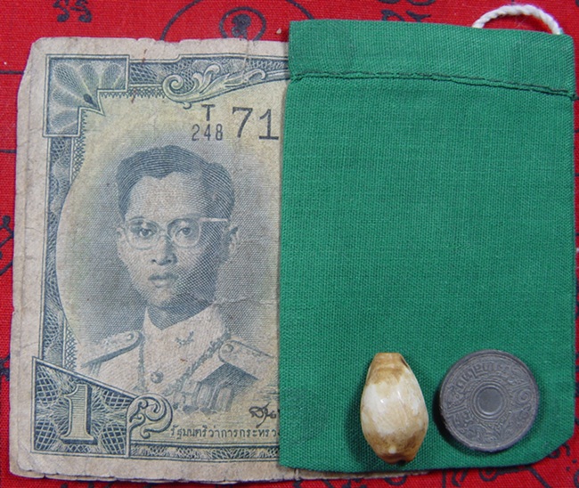 ถุงเขียวเหนี่ยวทรัพย์ คุณแม่บุญเรือน โตงบุญเติม ถุงเหนี่ยวทรัพย์สีเขียวอันเลื่องชื่อของคุณแม่บุญเรือน ซึ่งลูกศิษย์ทุกคนใฝ่ฝันอยากเป็นเจ้าของ มีรอยจารยันต์ "พุทโธ..."ด้วยดินสอ รูปที่ ๒ ตรงตำแหน่งข้างถุงซ้ายมือ ของจริงเห็นชัดครับ กว้าง ๔.๕ เซนติเมตร ยาว ๖.๕ เซนติเมตร ชิ้นนี้ใช้เป็นชิ้นครูได้ครับ |