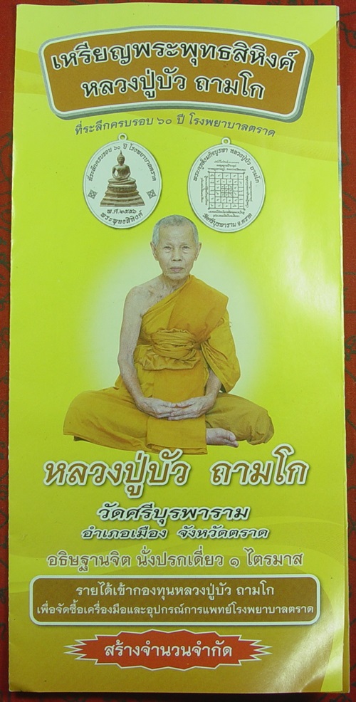 | ลป.บัว ถามโก เหรียญพระพุทธสิหิงส์โรงพยาบาลตราด 1 จำนวนเพียง 3,000 เหรียญ | ||