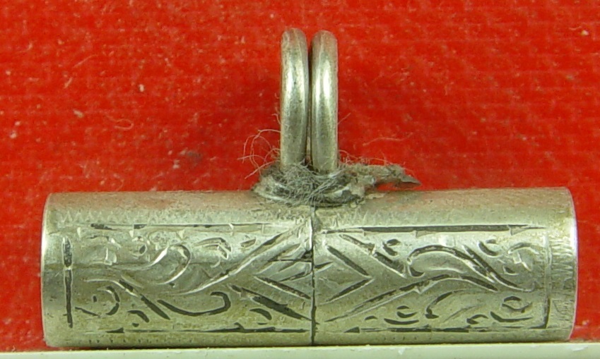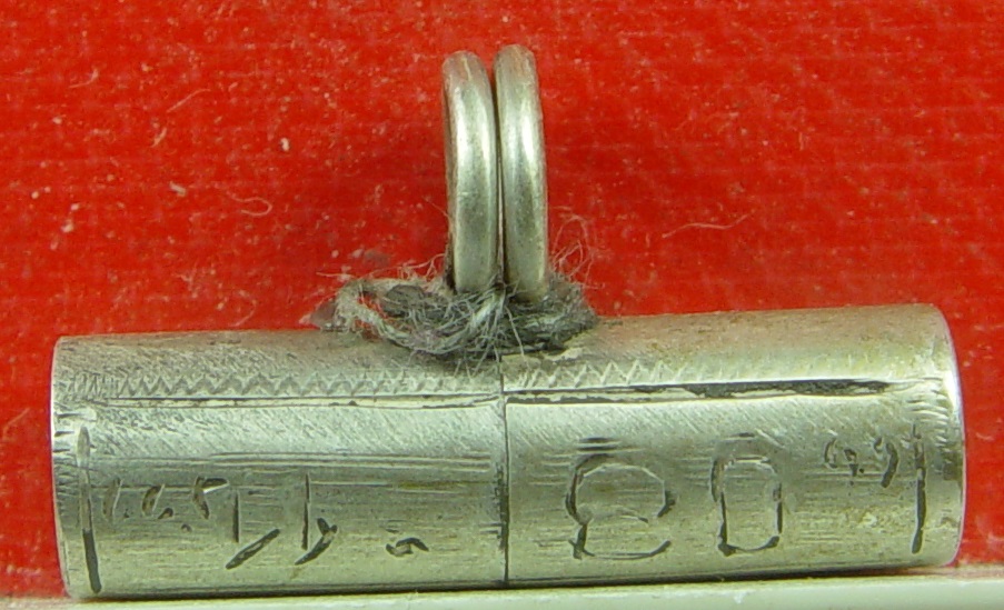ตะกรุด อ.นองเนื้อเงิน เดิมๆ ถ่ายภาพด้านข้างมาให้ชมเพิ่มเติมครับ เมื่อเขย่าดูมีวัตถุบางอย่างบรรจุอยู่ด้านในครับ ผูกด้ายสายสิญจ์มาเดิมๆ |
