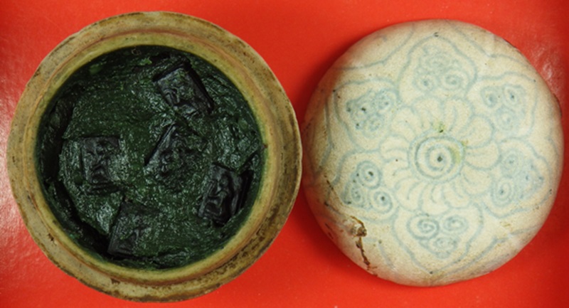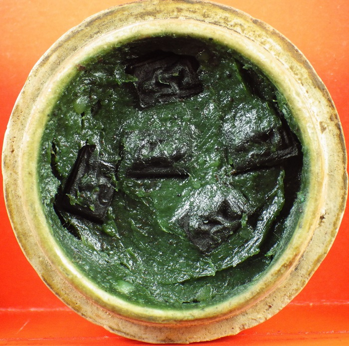 | ลพ.ทาบ วัดกระบกขึ้นผึ้ง สีผึ้งเขียว ตลับดินเผาโบราณเก่า เดิมๆพร้อมแช่นางกวักหายองค์ ของบ้าน น่าใช้ | ||
